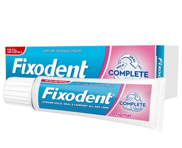 Κολλητική κρέμα Fixodent Denture με ελαφρύ άρωμα μέντας που δημιουργήθηκε ειδικά για πλήρη φροντίδα.