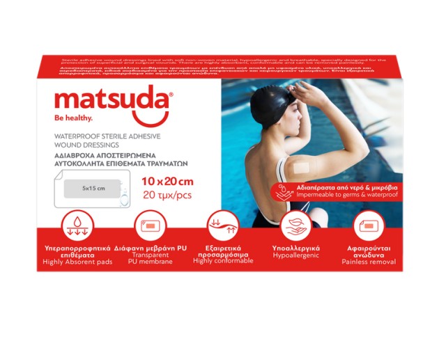 Τα αδιάβροχα αποστειρωμένα αυτοκόλλητα επιθέματα Matsuda είναι κατασκευασμένα από μαλακό, μη υφασμένο υλικό φλις, προσφέροντας στον χρήστη την μέγιστη δυνατή φροντίδα.