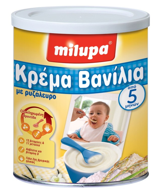 Η κρέμα Βανίλια Ρυζάλευρο της Milupa διατίθεται στα φαρμακεία και τα super market σε μεταλλική συσκευασία 300γρ.